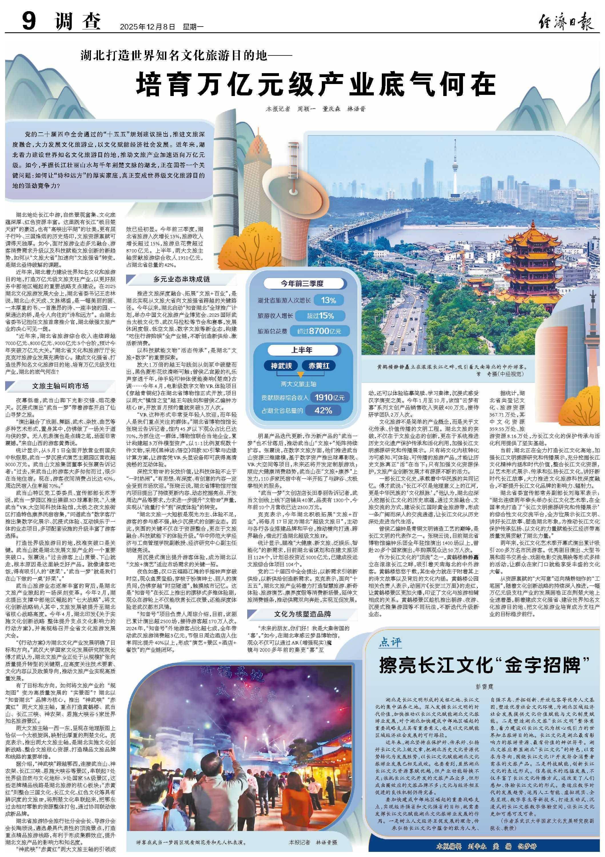 党的二十届四中全会通过的“十五五”规划建议提出,推进文旅深度融合,大力发展文化旅游业,以文化赋能经济社会发展。近年来,湖北着力建设世界知名文化旅游目的地,推动文旅产业加速迈向万亿元级。如今,手握长江壮丽山水与千年荆楚文脉的湖北,正在回答一个关键问题:如何让“诗和远方”的厚实家底,真正变成世界级文化旅游目的地的强劲竞争力?